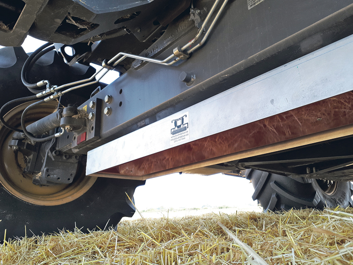 The drop pan is held up tight against the combine with electromagnets. Because there is no wiring or bolts, it can be moved from one combine to another in a matter of seconds. A radio remote control lets the operator drop the pan while he’s driving at the normal speed with all adjustments in their normal position. | Marcel Kringe photo