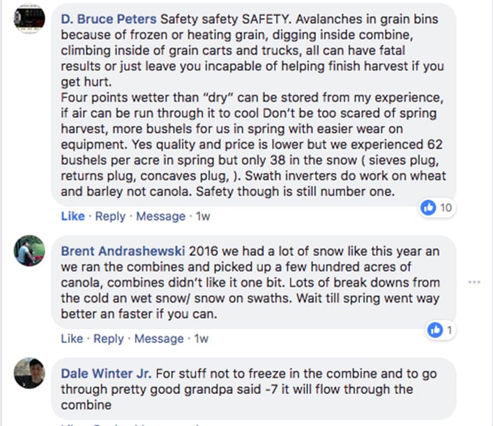 He said he’s seen too many dangerous situations over the past few years where growers put themselves at risk trying to finish harvest in the winter, especially when trying to extract tough grain lodged in bins.