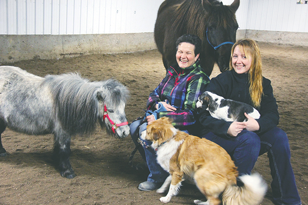 Magnusson and Maurer are surrounded by attention seeking animals, including Little Angel, a miniature horse. They visit nursing homes and birthday parties as part of the services offered by Discovery Ranch. | Christalee Froese photo