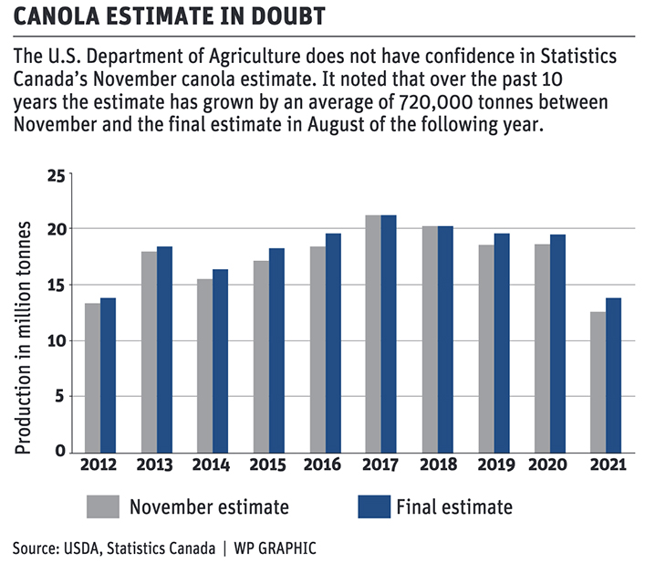 The U.S. Department of Agriculture has little faith in Statistics Canada’s November canola production estimate.