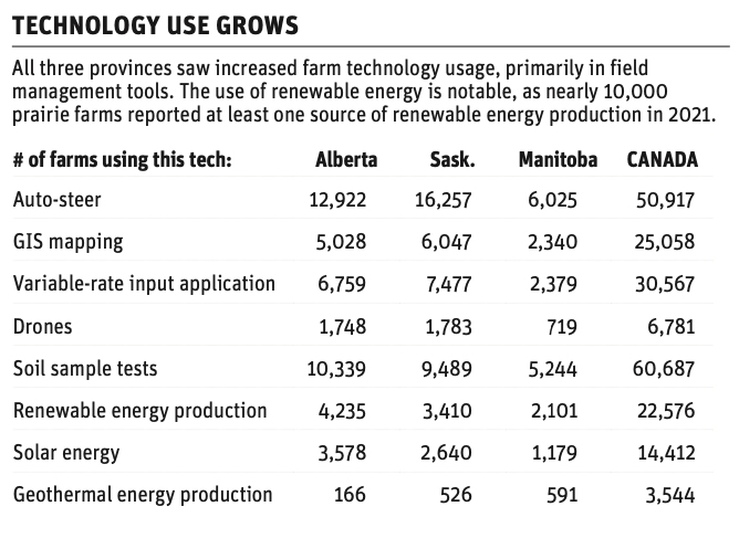 Drone use is also becoming more popular among farmers. Saskatchewan led slightly in that category, ahead of Alberta.