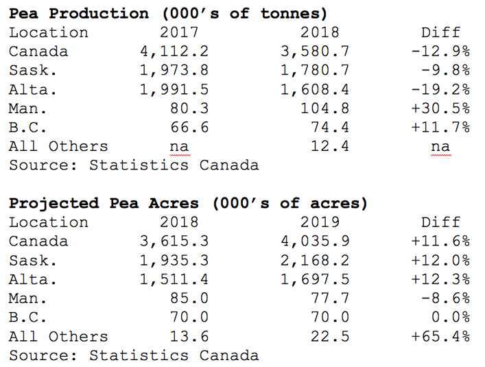For 2019, Statistics Canada projected dry pea acres in Manitoba to drop 8.6 per cent to 77,700. Although that’s the third most acres in the country, Manitoba’s crop is a fraction of the peas grown in Saskatchewan and Alberta.