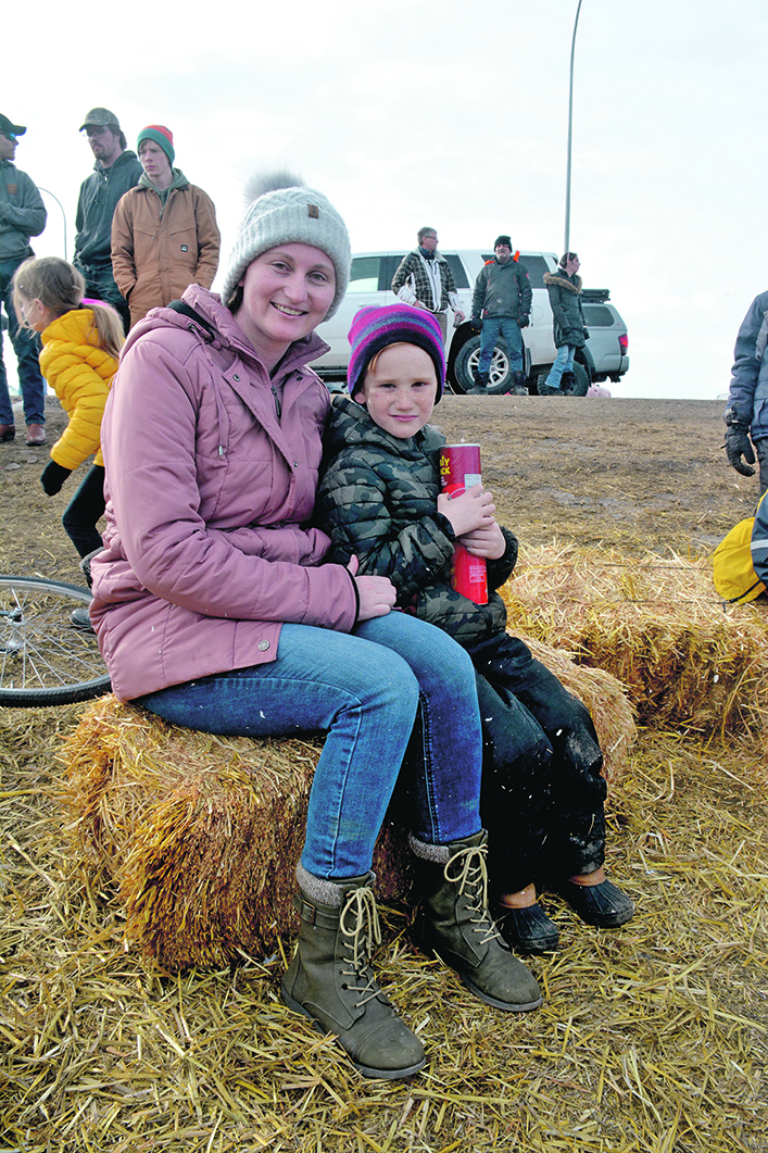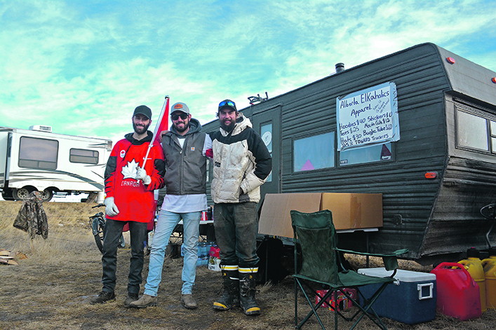 Jordan and bison rancher Jon Taylor along with Cory Gerrish at their camp at the Milk River site of the Coutts protest against pandemic restrictions where more than 100 people had been served up elk on a bun on Sunday.Eva Schmitt sits with her son, Oliver, 7, near on of several fire pit sites set up at the Milk River site of the Coutts protest.Supporters mingled, ate and danced Feb. 6 at the Milk River site while protesting for the end of pandemic restrictions. | Alex McCuaig photo
