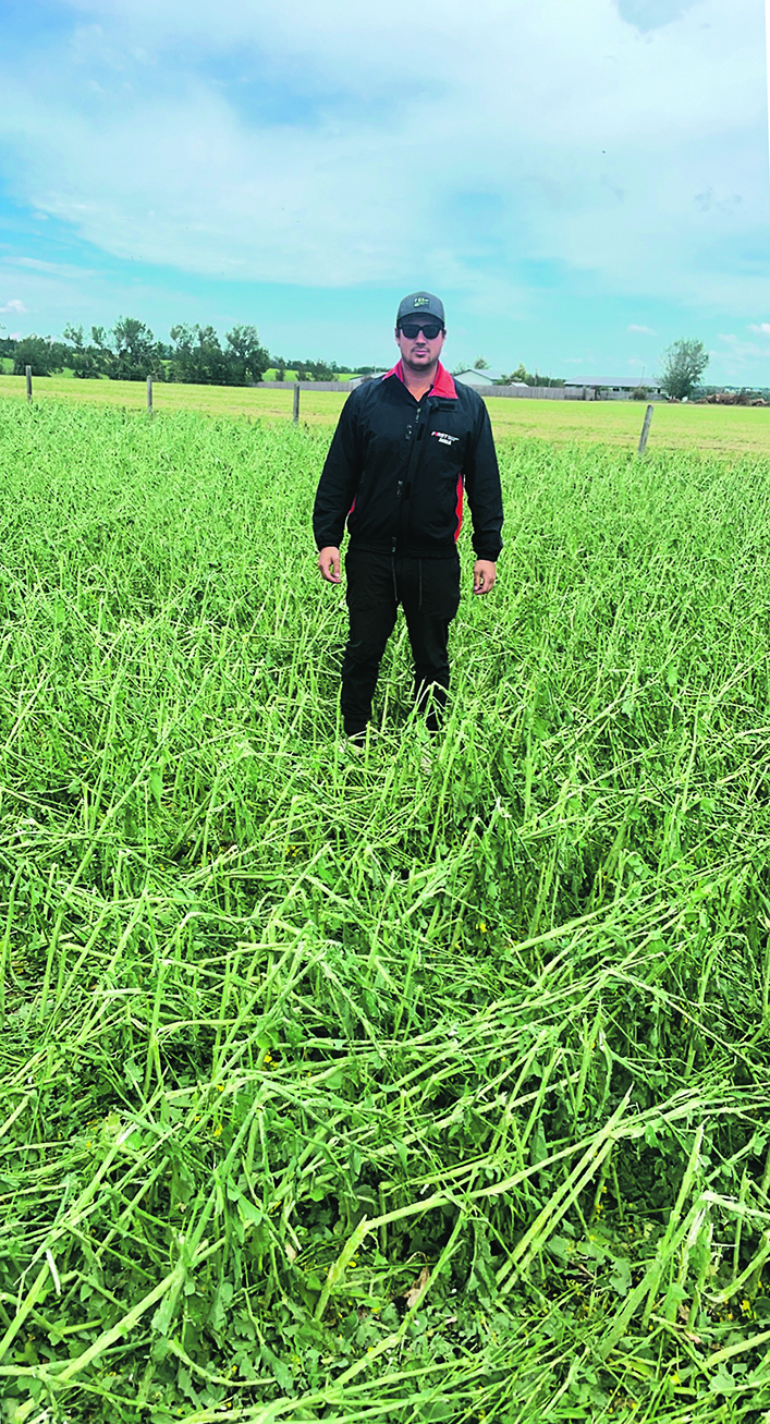 Dale Winter’s canola crop was looking good July 13 when he posed for a photo on his birthday on his farm near Ponoka, Alta. | Photo supplied by Dale Winters