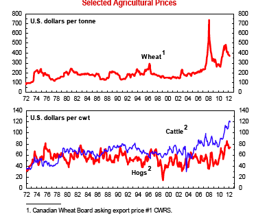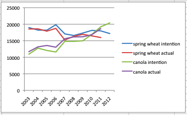 Here are some charts that tell pretty interesting ag commodity stories. The first was produced by our markets editor, D’arce McMillan, while we were sorting though all the StatsCan Seeding Intentions report stuff. Check out the numbers on the table and the lines on the chart that show the same thing: farmers on the prairies have steadily upped their acreage of canola and generally reduced their planned acreage of spring wheat over the past decade. And as seeding goes on, farmers add more acres to canola and cut wheat acres.