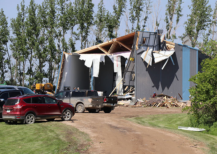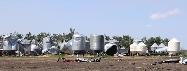 Their new farm shop was hammered and grain bin yard shattered, leaving bins and debris scattered over nearby fields and closing the highway and the railway track and knocking down powerlines, but sparing their home. No one was in it at the time.
