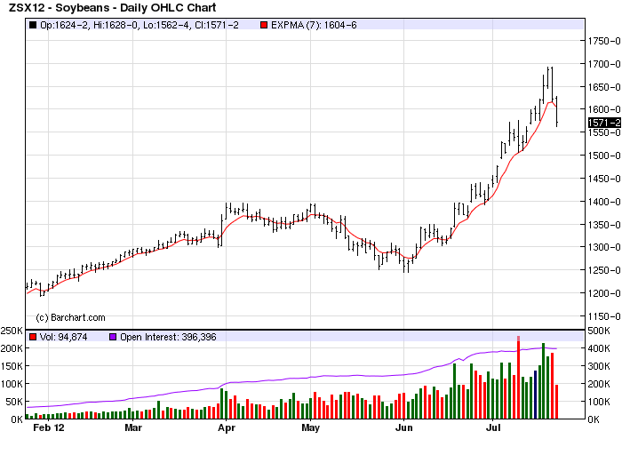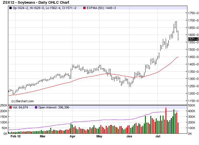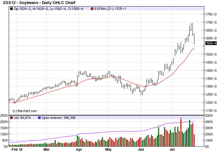 But can anyone safely declare that the soybean rally is going bust? If you look at it on a simple, short term chart it appears like a classic peak and fall.